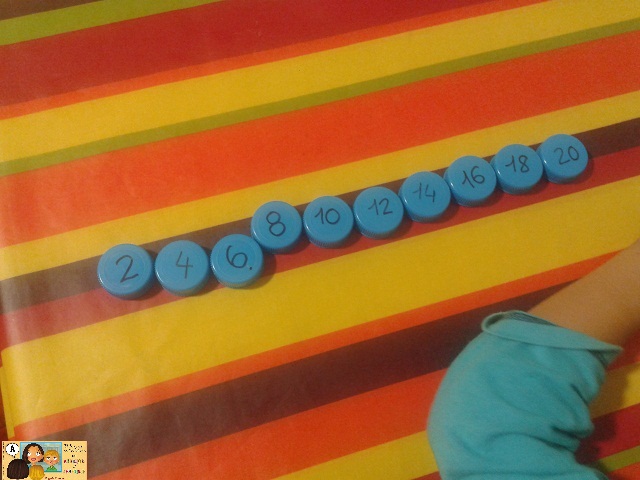 Hoy he improvisado un juego con mi hijo Daniel, he cogido tapones de plástico de botella (siempre los guardo para hacer juegos en el cole) y con un rotulador permanente le he escrito los números del 1 al 20 y luego los signos del + y del - para trabajar con él las sumas y las restas. Además hemos jugado a contar de dos en dos, luego yo le quitaba algunos tapones y él tenía que completar... le ha gustado tanto que luego él mismo se ha inventado el juego de meter los tapones en la caja encestándolos como si fuera un partido de baloncesto, jaja.